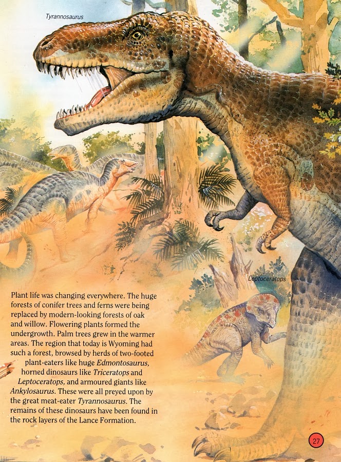 Of course, Tyrannosaurus gets to steal the limelight, crashing right into the foreground and roaring and splattering dribble all about the place. Happily, this illustration of Rexy appears to owe nothing to Sibbick's Normanpedia version, although that background Edmontosaurus looks suspicious. Elsewhere, Leptoceratops shouldn't be wandering around alone without competent adult supervision.